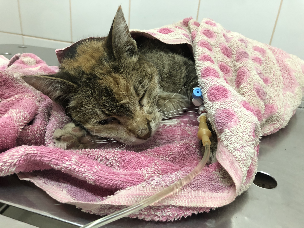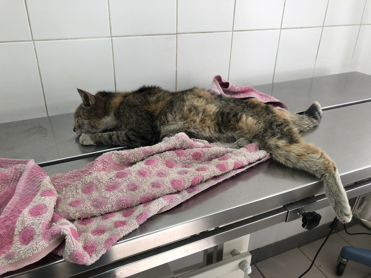 Кошка найдена на улице без сознания, в тяжелом состоянии была осмотрена в 2 клиниках, сделано УЗИ, взят клинический анализ крови и биохимия. Предлагали эвтаназию, но случилось чудо — кошка позитивно реагирует на лечение!