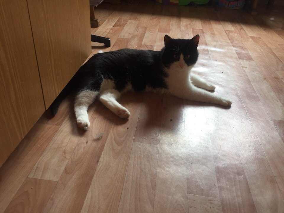 Этого черно белого крупняша мы забирали с одной из теплотрасс нашего города. Очаровательный мальчишка, измученный жизнью на улице первые 2 дня просто спал и ел, потом начал постепенно проявлять интерес к другим животным, игрушкам, людям. После визита к ветеринару выяснилось что у хвостика в 10 месяцев куча проблем: почки, печень, забитый песком мочевой и сниженный иммунитет. Почти полтора месяца мы лечились а теперь нашему самому мурчащему лежебоке пора на кастрацию и в пиар.