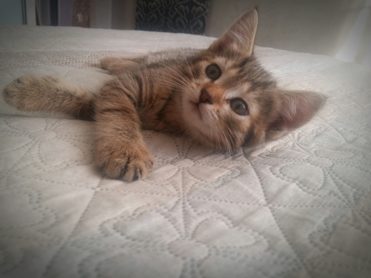 2,5 месяца от кошки мышеловки и папы сибирского кота. Добрая, ласковая и милая. Желательно в частный дом. К лотку приучена.