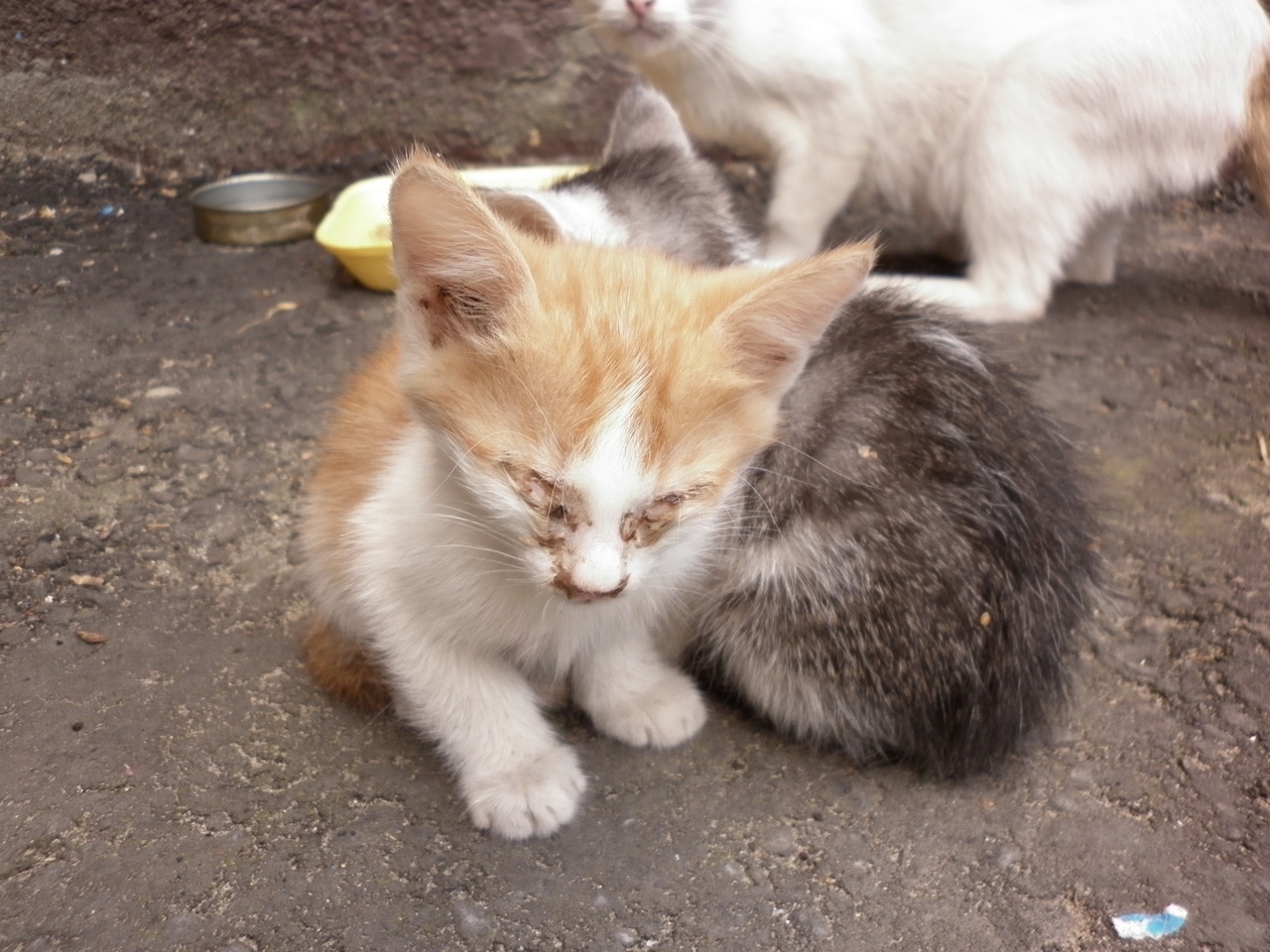 Срочно нужна помощь и передержка! В подвале начали травить блох, и кошка вынесла котят. Я одного взяла, но у меня собака и куча кошек-больше нет места и сил ухаживать. Котята нуждаются в лечении. Глаза, уши и неимоверное количество блох. Осталось три котенка.